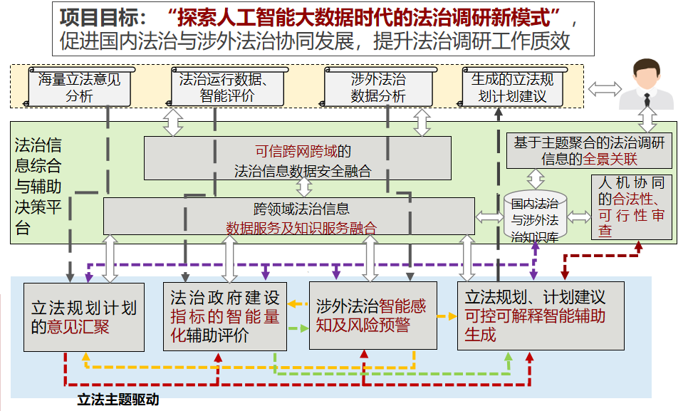 本项目紧扣指南要求,针对法治调研意见种类多、分类工作量大,法治政府建设示范指标体系亟须量化,面向国内法治和涉外法治协同的立法规划、计划建议编制难等问题,研究面向法治调研的立法规划、计划的意见特征智能识别技术;研究基于多语言语义理解的涉外法治智能感知及风险预警技术;研究面向法治政府建设示范指标体系的智能量化评估技术;研究基于主题序列生成的立法规划、计划建议的辅助生成技术;研制基于跨域知识全生命周期管理的法治信息综合与辅助决策平台,并开展应用示范。面向法治调研的多元意见特征识别、涉外法治感知预警、法治政府建设指标量化、规划计划建议辅助撰写、国内法治与涉外法治协同决策5个业务场景,从系统论角度出发,研究同时满足科学立法、民主立法、依法立法需求的跨领域知识驱动的法治调研智能感知及辅助决策技术,进而突破人工智能大数据时代的法治调研新模式。