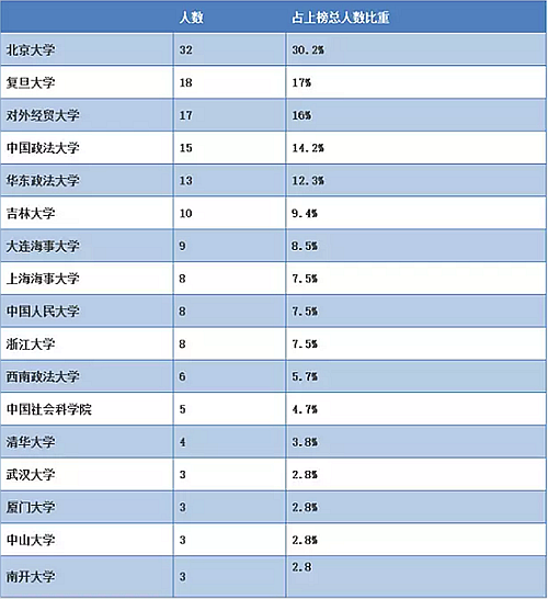 根据榜单不难看出京沪高校法学教育包揽了榜单Top100中的所有国内高校,京沪毫无疑问也成为“巨律”们的聚集地。