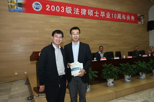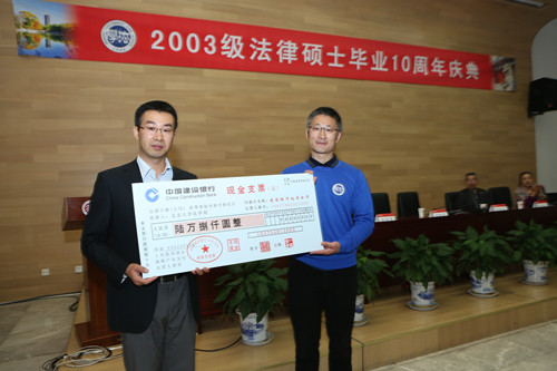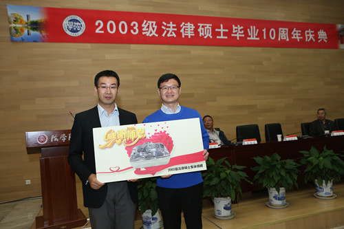 庆典最后,为支持学院发展,2003级法律硕士全体校友为学院师生捐赠了保温餐具、图书,并新设助学金,鼓励学弟学妹努力学习,希望老师们保持身体健康。