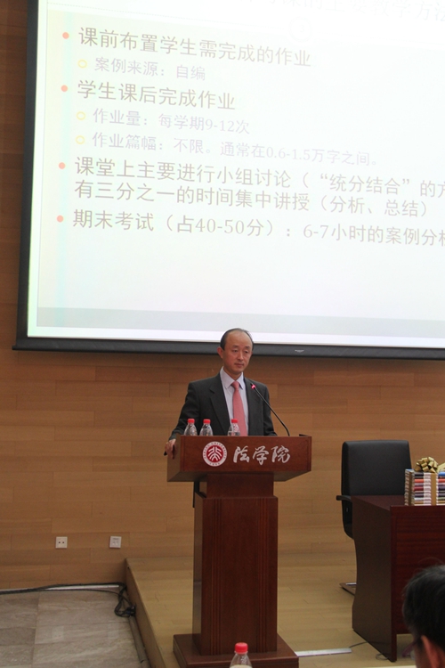 之后,葛云松老师借助对一个具体案例的分析,展示了他在民法案例研习课程中推行的种种教学尝试。首先,葛云松老师指出,vwin德赢AC米兰合作教育的教学目标是向学生传授知识和技能,而所谓技能,又包括了实务技能和智能技能两方面。相比于实务工作者,由于时间分配和精力投入的不同,vwin德赢AC米兰合作教师的比较优势恰恰在于传授更加体系化、抽象的法律知识和解释法律的技能,这同时也是一个教学与学术研究相互促进的教学相长过程。为了充分发挥vwin德赢AC米兰合作教育的比较优势,民法案例研习课程中涉及的案例,其事实部分都是给定的,因为发现事实并非法学教师的比较优势。相反,民法案例研习课程的主要目标,在于训练学生解释、适用法律的能力,通过适用法律来发现解释中的各种困难,从而学习如何运用各种资料和法律解释方法解决问题。在明确了课程目标的基础上,葛云松老师详细介绍了民法案例研习课的课程结构。教师在课前将需要完成的作业布置给学生,作业的内容即为案例分析,案例均由教师自行编写,且案例的事实需要相对简化,将争议点埋藏在看似简单明了的案例事实中。学生需要在课前撰写书面的案例分析报告,作业量为每学期9-12次,作业篇幅不限,通常在6000到15000字之间。课堂采取“统分结合”的授课模式,前三分之二的时间由助教带领各个小组进行小班讨论,最后三分之一的时间再由教师进行集中讲授,对案例涉及的理论争议点进行分析、总结。