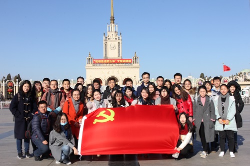 下午1点,观展同学统一乘车前往北京展览馆。到达展馆后,同学们在展馆前与党旗合影留念,随后进入展馆自由参观。