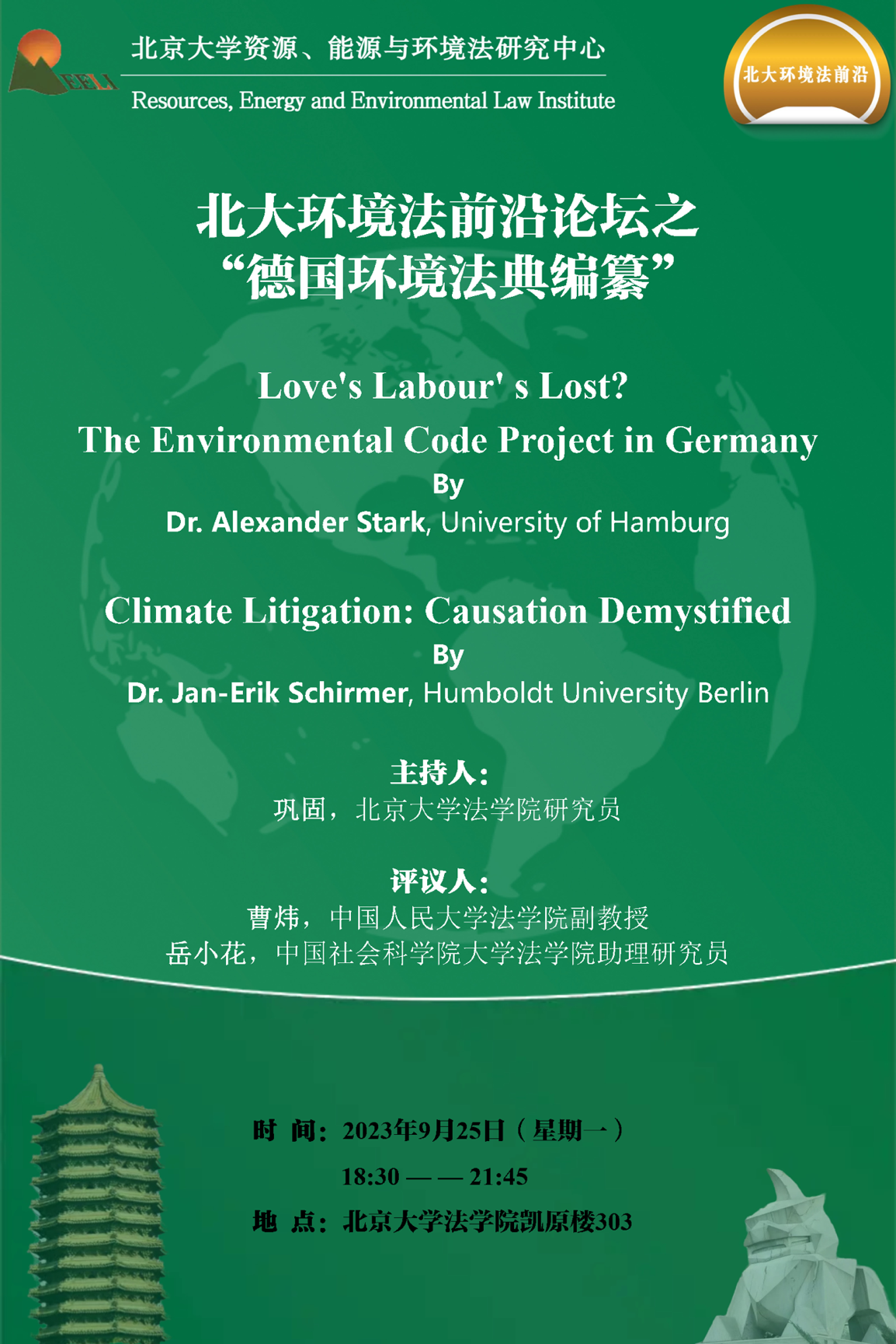 北大环境法前沿论坛之 “德国环境法典编纂”2023年9月25日,由vwin德赢资源、能源与环境法研究中心与德国汉斯·赛德尔基金会(Hanns Seidel Stiftung)合作举办的北大环境法前沿论坛之“德国环境法典编纂”在vwin德赢凯原楼303会议室举办。本次论坛由vwin德赢研究员巩固主持,邀请德国环境法领域两位杰出...192023 10月 -